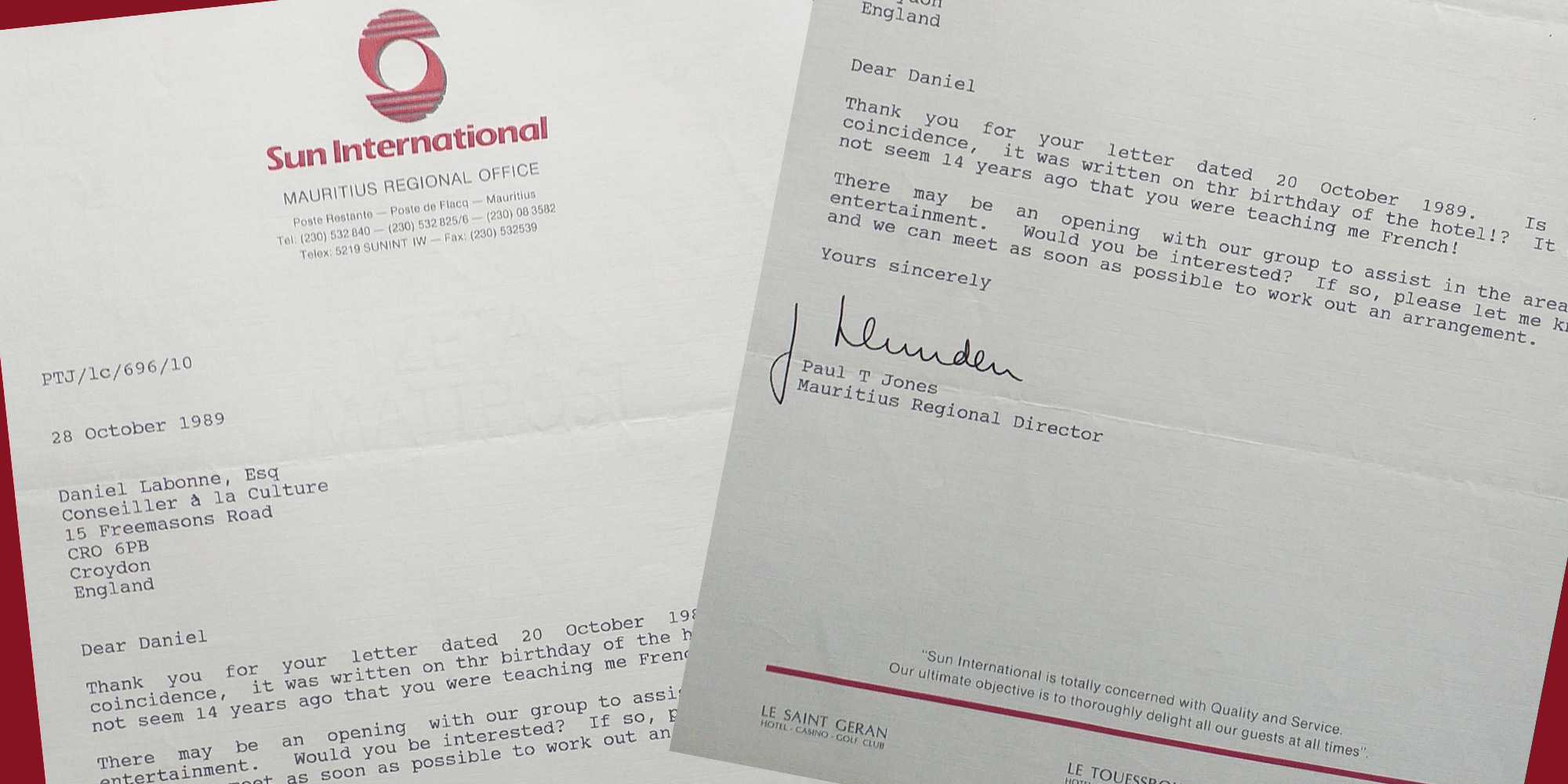 Lettre d'un étudiant privé, directeur général de Sun International à l'Ile Maurice, qui a appris le Français de Daniel Labonne.