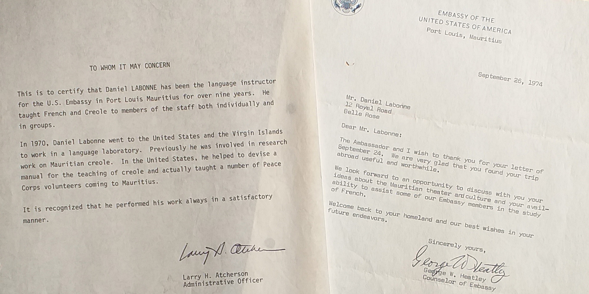 Lettre de référence de diplomates ayant été des étudiants privés (en langues française et créole) de Daniel Labonne