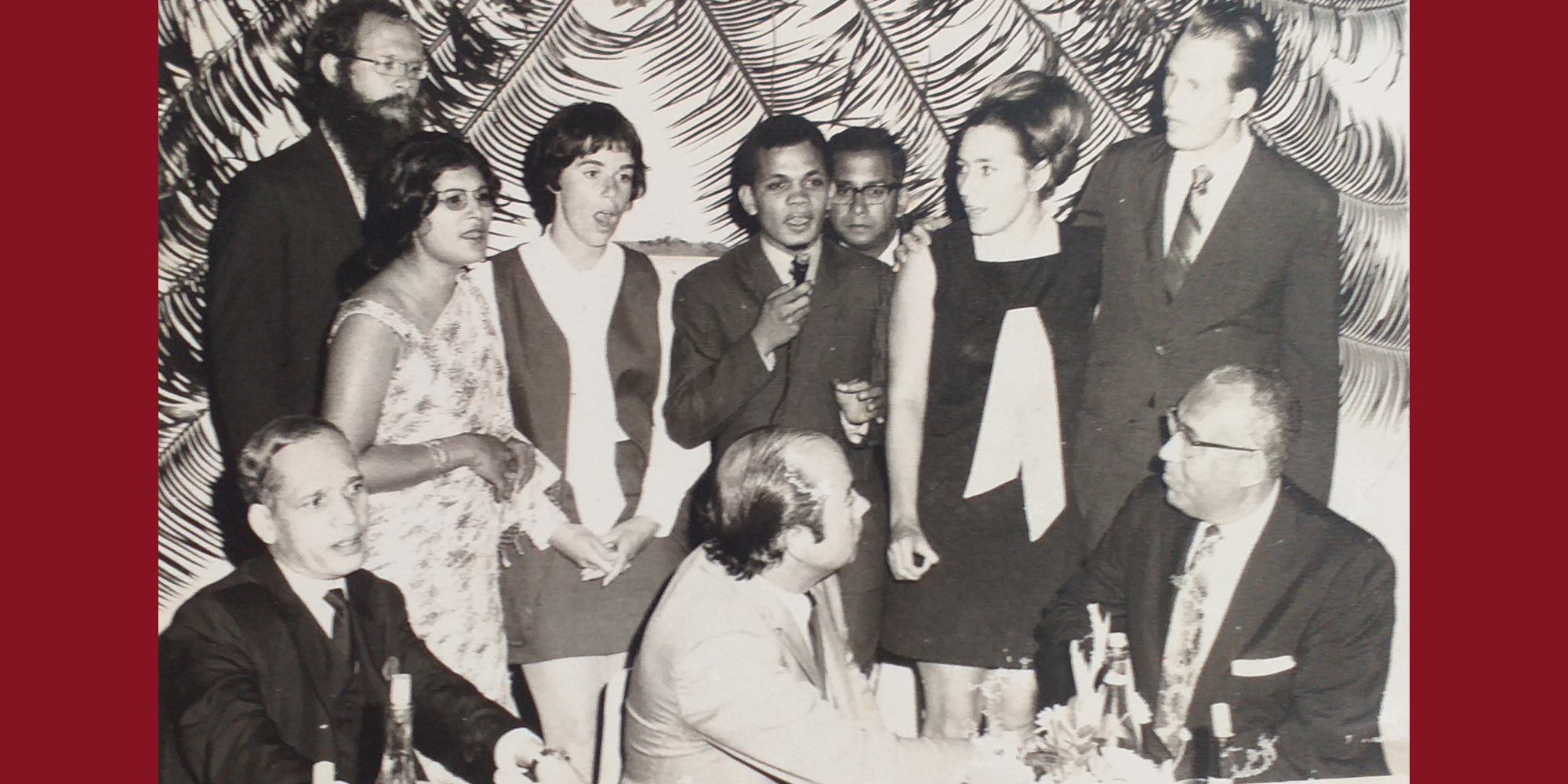 Au Laboratoire des langues de St Thomas aux Iles Vierges, aux Caraïbes, la la langue creole est étudiée et enseignée. Reception en presence de l'ambassadeur de Maurice a Washington, M. G. Balancy (assis a gauche) et le gouverneur de l'ile (assis a droite) Daniel Labonne, chercheur et instructeur, au micro.
